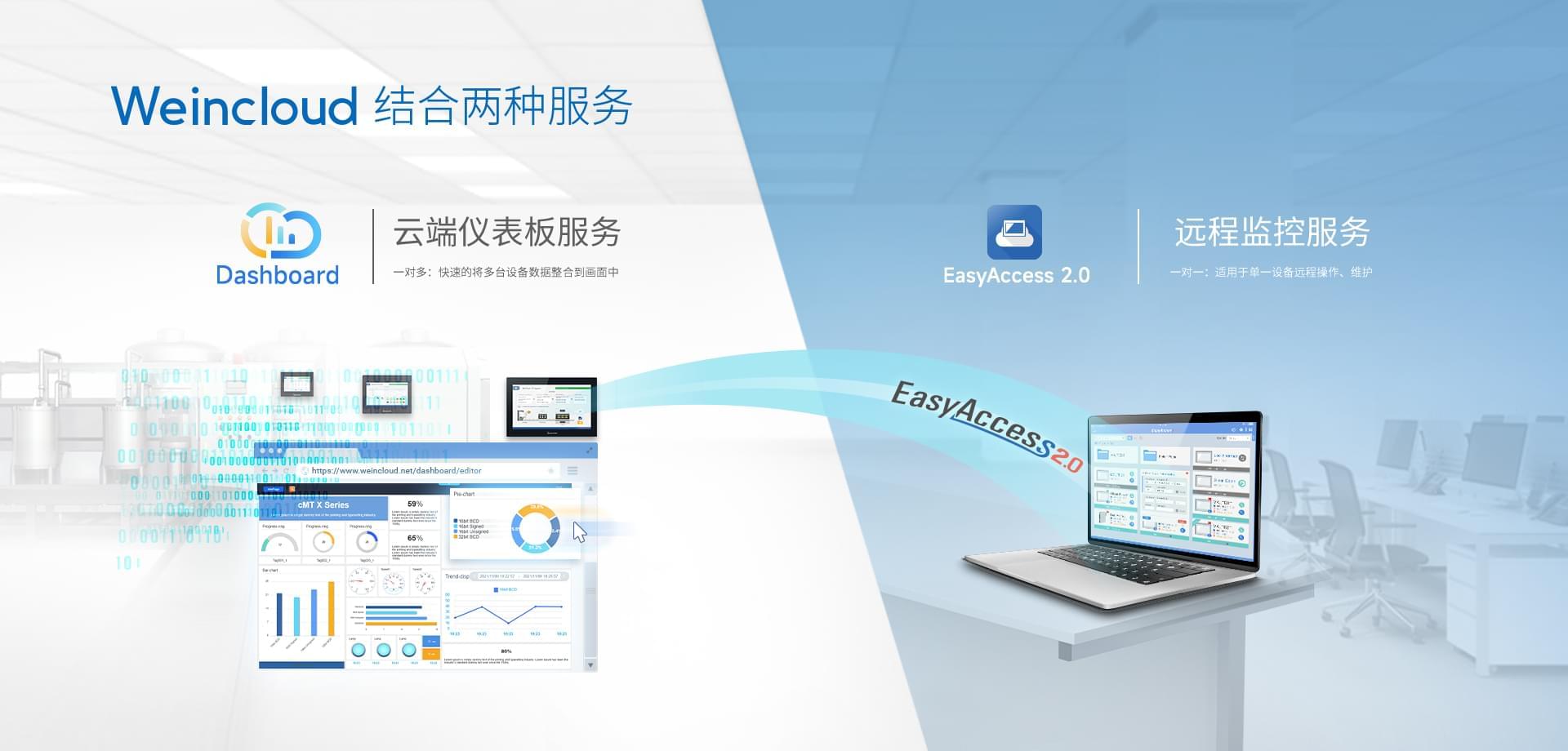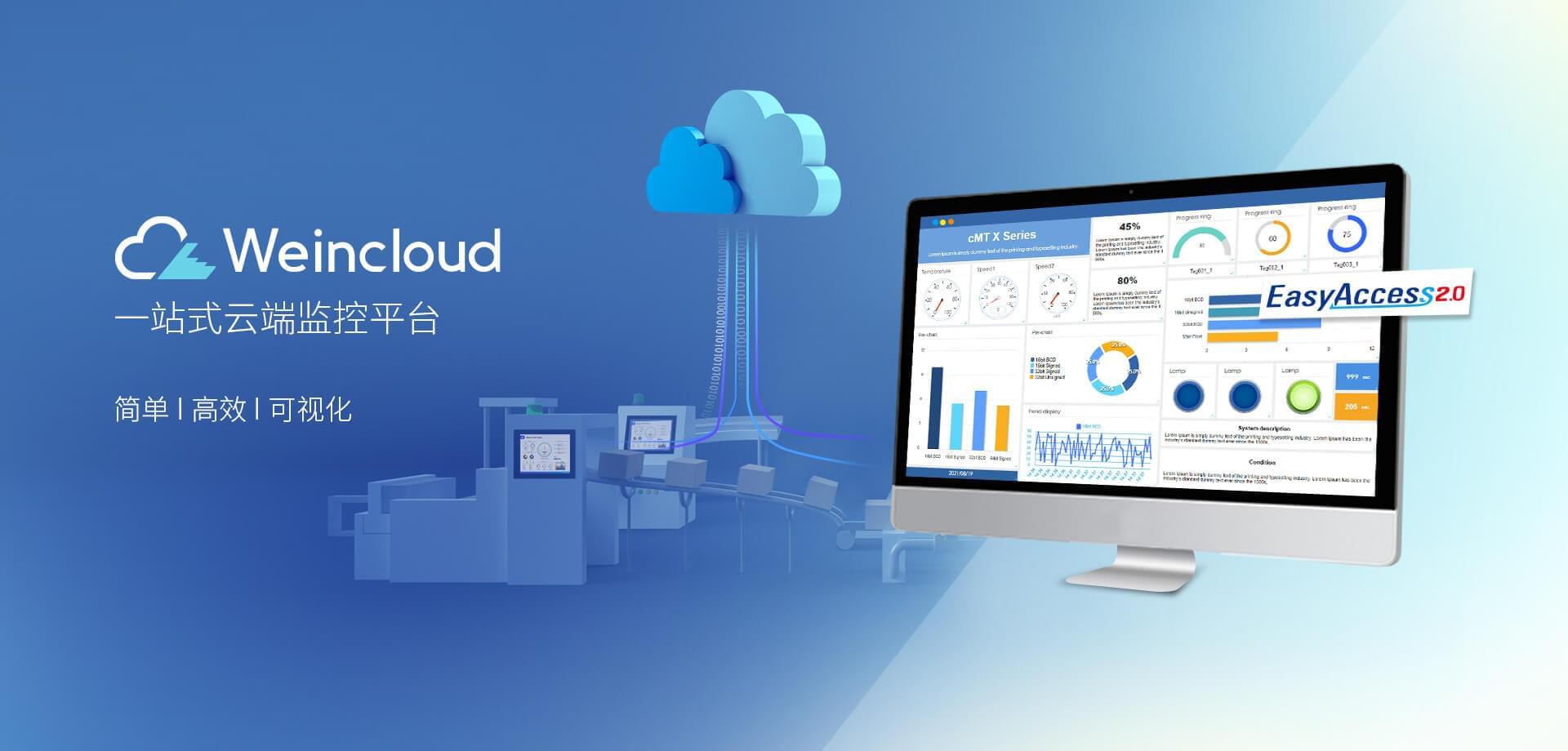 Weincloud 集結(jié)EasyAccess2.0遠程監(jiān)控服務及Dashboard云端儀表服務,將設備資料數(shù)據(jù)上云并以視覺化呈現(xiàn),協(xié)助管理者實時掌控現(xiàn)場產(chǎn)線狀態(tài)。